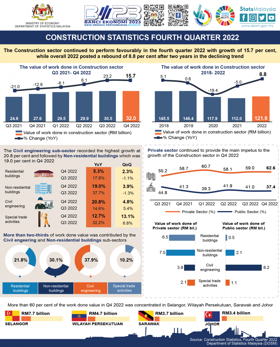 The full publication of the Quarterly Construction Statistics, Fourth Quarter 2022 can be downloaded through eStatistik portal.